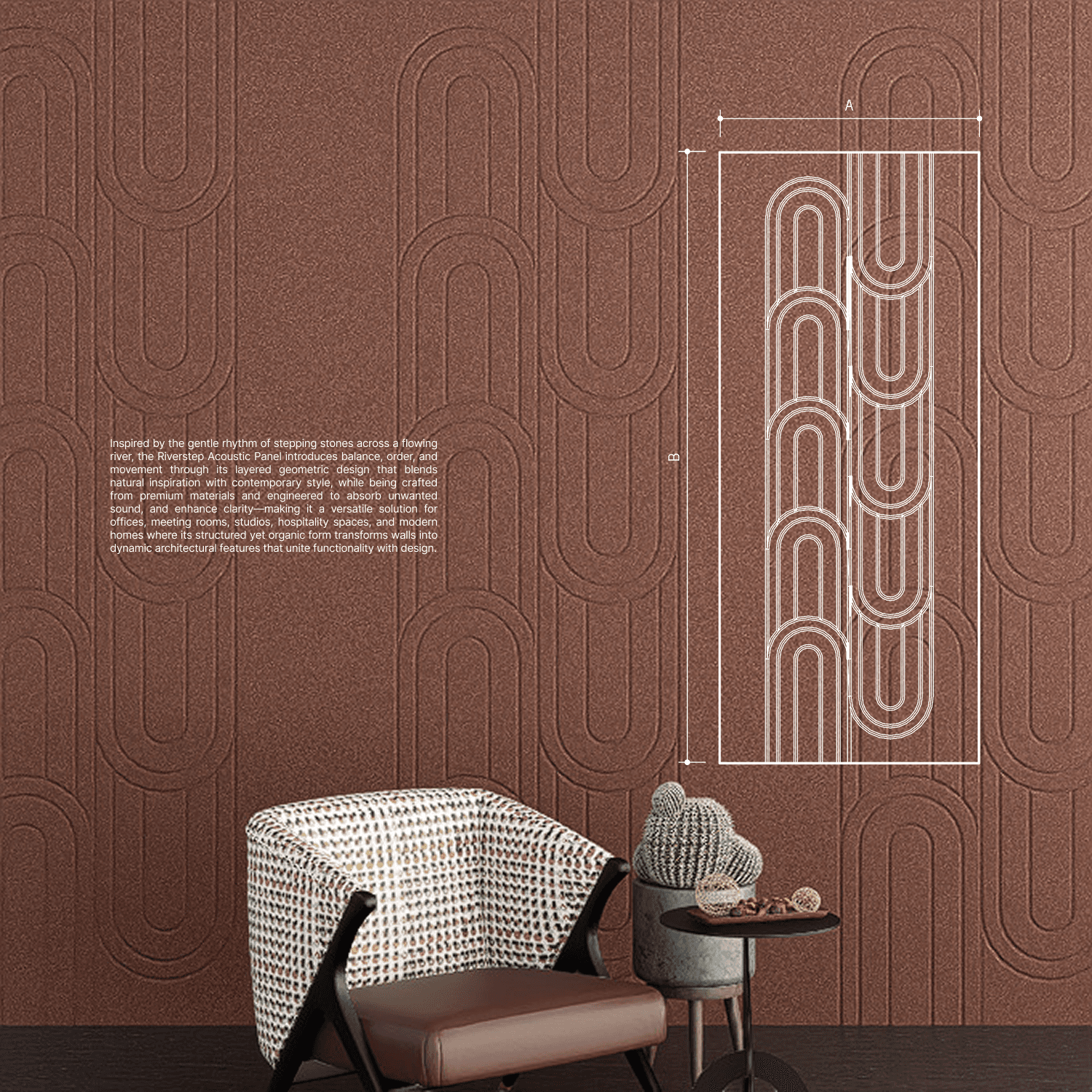 Inspired by the gentle rhythm of stepping stones across a flowing river, the Riverstep Acoustic Panel introduces balance, order, and movement through its layered geometric design that blends natural inspiration with contemporary style, while being crafted from premium materials and engineered to absorb unwanted sound, and enhance clarity—making it a versatile solution for offices, meeting rooms, studios, hospitality spaces, and modern homes where its structured yet organic form transforms walls into dynamic architectural features that unite functionality with design.