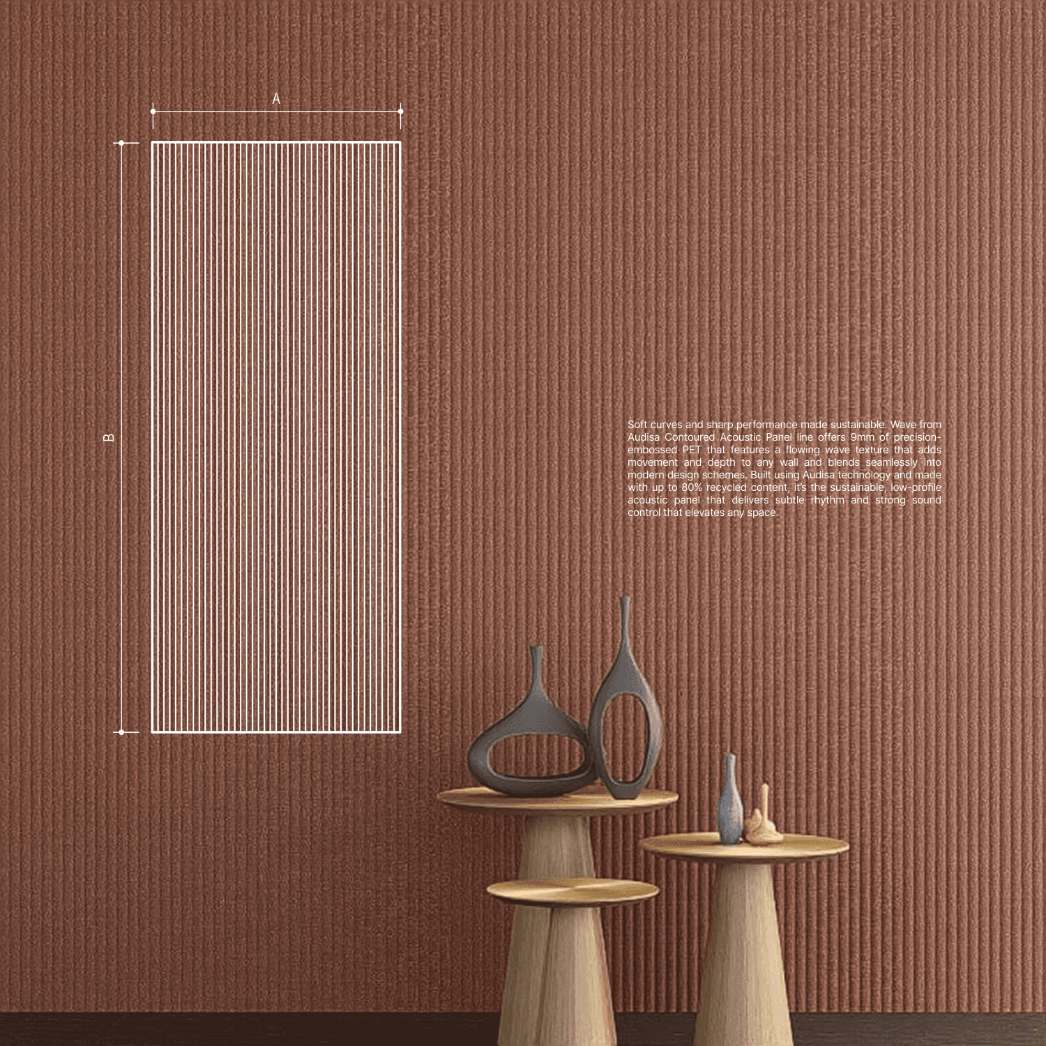 Soft curves and sharp performance made sustainable. Wave from Audisa Contoured Acoustic Panel line offers 9mm of precision-embossed PET that features a flowing wave texture that adds movement and depth to any wall and blends seamlessly into modern design schemes. Built using Audisa technology and made with up to 80% recycled content, it’s the sustainable, low-profile acoustic panel that delivers subtle rhythm and strong sound control that elevates any space.